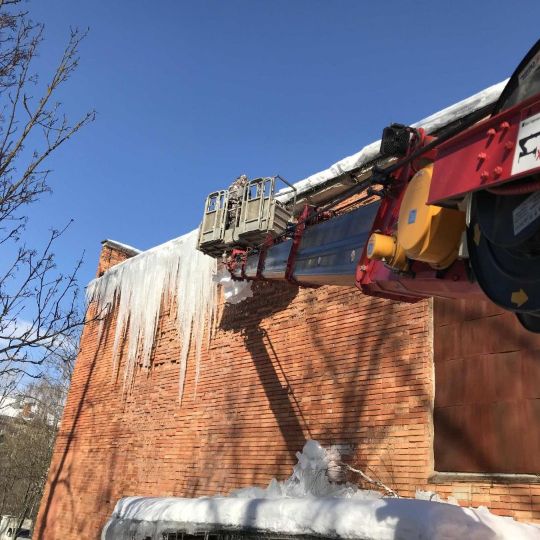 Чистка крыш от наледи и снега с помощью автовышки и опытных рабочих