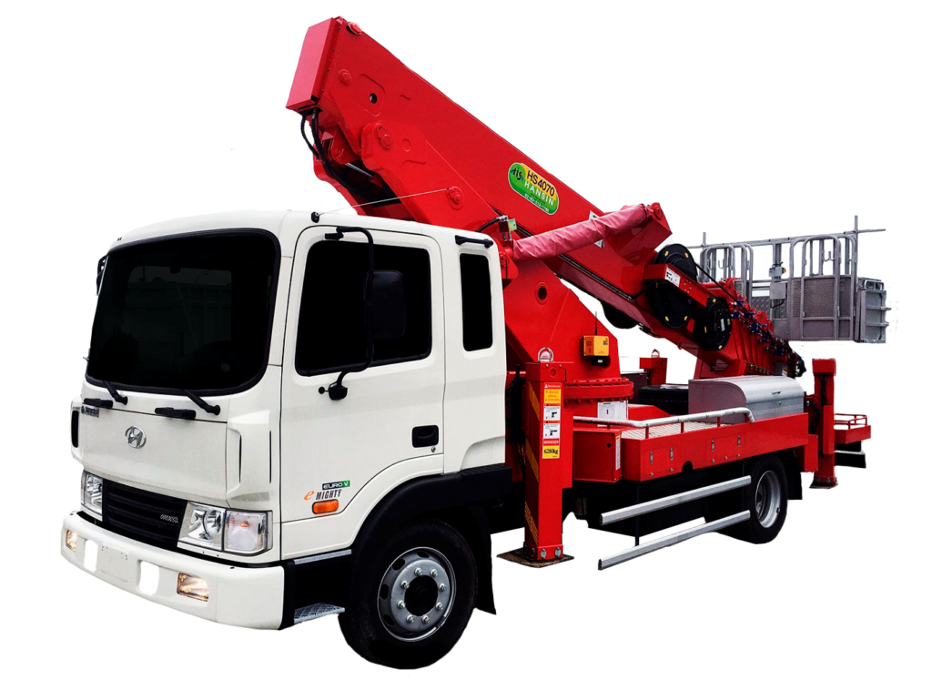 Телескопическая автовышка Hansin 40 метров на шасси Hyundai Gold с поворотной и раскладной люлькой г/п 400 кг.